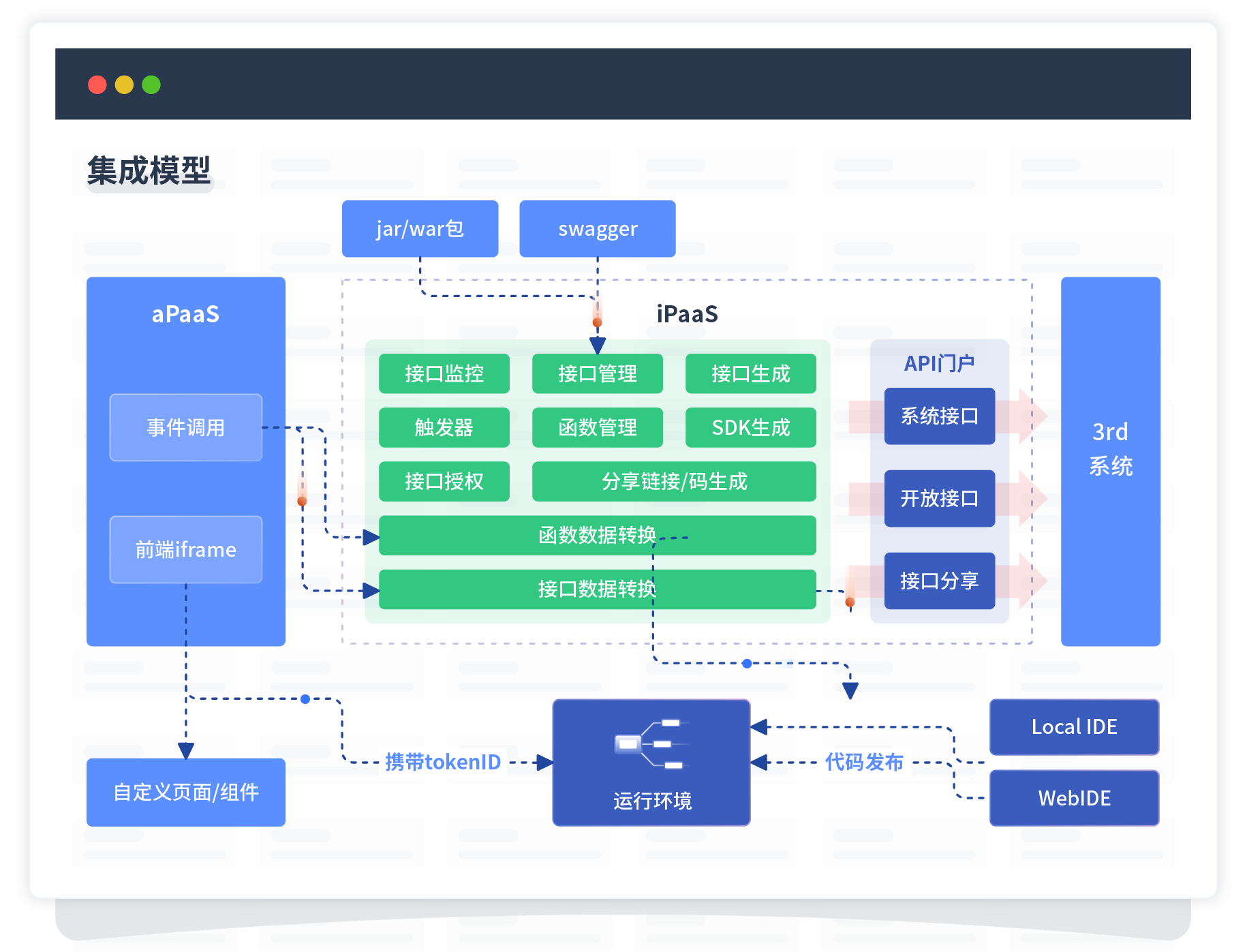 集成模型包括平台本身前、、后端能力的扩展,,,也支持通过API门户和第三方系统进行交互。。。。