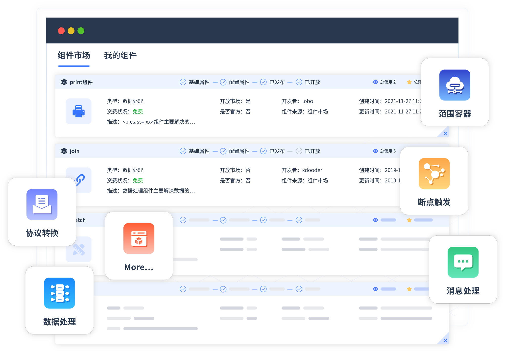针对集成场景,,,圆梦钱包提供组件市场,,例如协议转换、、、消息处理、、文件操作等。。。除平台提供的组件外,,,客户可以自定义所需组件。。