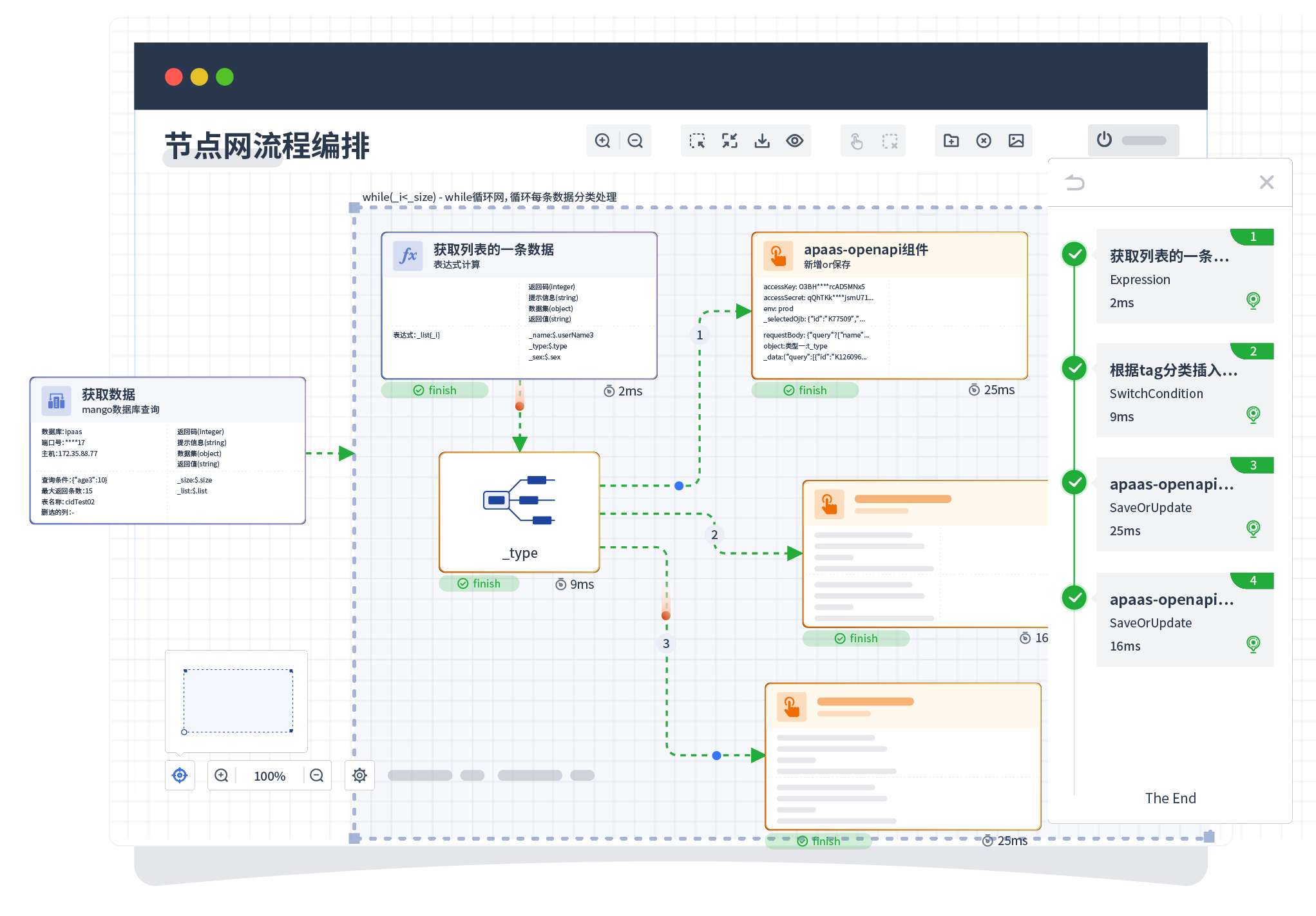 针对集成场景,,组件定义后支持进行流程编制,,,不同于传统代码方式,,,通过图形化展示,,支持在线调试、、、日志查看和运行回放。。。